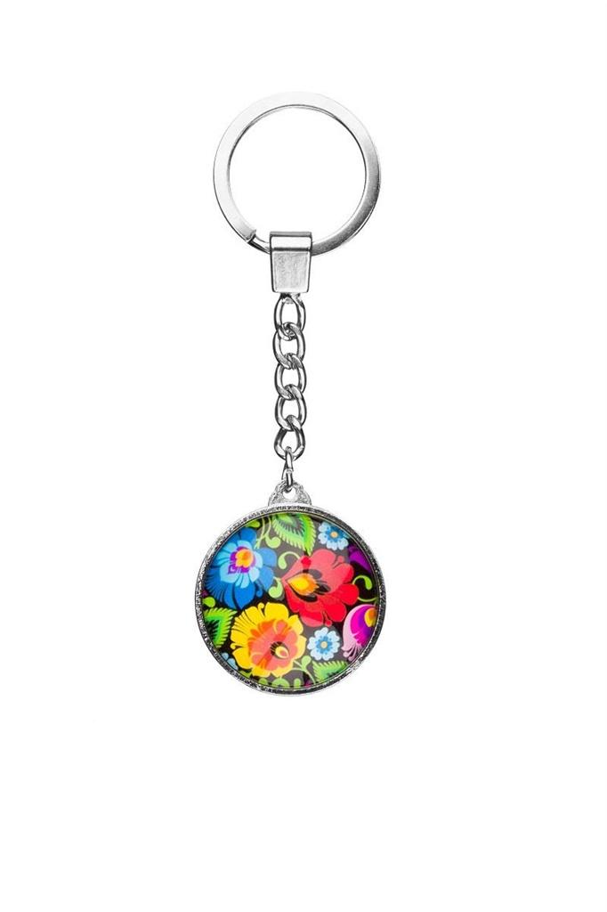 Ludowy brelok zdobią barwne kwiaty z łowickiej wycinanki na czarnym tle. Wzór ten inspirowany jest tradycyjnym wzorem ludowym z regionu łowickiego. Elementem przewodnim na łowickich wycinankach są koguty, pawie oraz motywy kwiatowe. Więcej informacji o łowickich wycinankach znajdziesz na naszym blogu magazyn.folkstar.pl