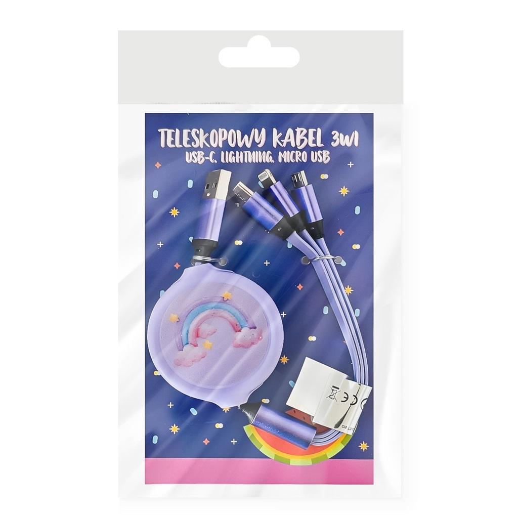 Produkt posiada 3 różne końcówki do ładowania oraz ponad metrowy, rozsuwany kabel co sprawia, że jest niezwykle użyteczny i uniwersalny. Kabelki do ładowania posiadają ciekawe kolory oraz grafikę. Długość kabelków po rozciągnięciu: 110 cm. Ładowanie: Micro/Lightning/Type C