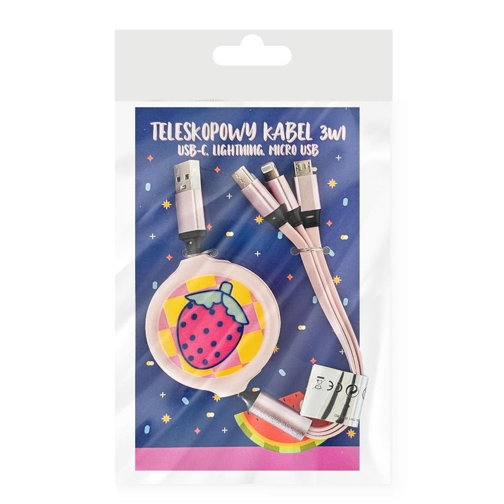 Produkt posiada 3 różne końcówki do ładowania oraz ponad metrowy, rozsuwany kabel co sprawia, że jest niezwykle użyteczny i uniwersalny. Kabelki do ładowania posiadają ciekawe kolory oraz grafikę. Długość kabelków po rozciągnięciu: 110 cm. Ładowanie: Micro/Lightning/Type C