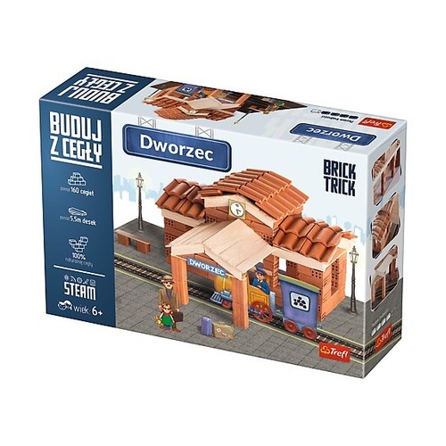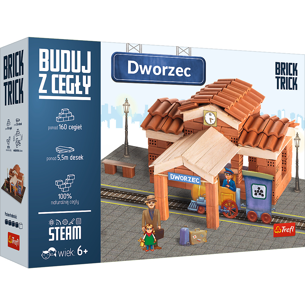 Brick Trick - Zabawa Murowana! Zostań konstruktorem, wykorzystując do budowy prawdziwe cegły i drewno! W instrukcji znajdziesz obszerne ciekawostki prosto z placu budowy. Dowiedz się, jak urozmaicić swoją konstrukcję dzięki wielu interesującym pomysłom i rozwiązaniom. Buduj według instrukcji lub użyj wyobraźni do stworzenia własnej, niepowarzalnej konstrukcji. Możesz też połączyć kilka budynków, tworząc klimat wsi, miasta lub średniowiecza. Wybuduj dworzec kolejowy, wykorzystując prawdziwe cegły i drewno. Skorzystaj z dołączonych planów budowy lub użyj wyobraźni do stworzenia niepowtarzalnej konstrukcji. Baw się dołączonymi pionkami prosto z miejskiego świata! To nie koniec zabawy! Rozpuść konstrukcję w wodzie i buduj dalej wykorzystując ponownie te same cegły! W zestawie znajdziesz: prawdziwe cegły, klej, drewniane deseczki, pionki, podstawkę, naklejkę i instrukcję! Dla dzieci w wieku od 6 lat