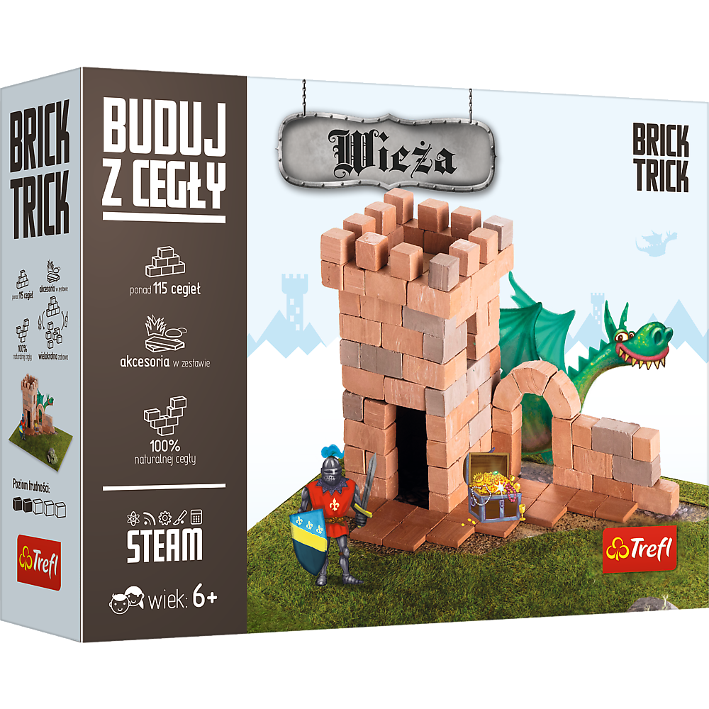 Brick Trick - Zabawa Murowana! Zostań konstruktorem, wykorzystując do budowy prawdziwe cegły i drewno! W instrukcji znajdziesz obszerne ciekawostki prosto z placu budowy. Dowiedz się, jak urozmaicić swoją konstrukcję dzięki wielu interesującym pomysłom i rozwiązaniom. Buduj według instrukcji lub użyj wyobraźni do stworzenia własnej, niepowarzalnej konstrukcji. Możesz też połączyć kilka budynków, tworząc klimat wsi, miasta lub średniowiecza. Wybuduj wspaniałą wieżę, wykorzystując prawdziwe wielobarwne cegły, drewno i elementy dekoracyjne jak trawę czy krzewy. Skorzystaj z dołączonych planów budowy lub użyj wyobraźni do stworzenia niepowtarzalnej konstrukcji. Baw się dołączonymi pionkami prosto z epoki średniowiecza! To nie koniec zabawy! Rozpuść konstrukcję w wodzie i buduj dalej wykorzystując ponownie te same cegły! W zestawie znajdziesz: prawdziwe cegły, klej, drewniane deseczki,elementydekoracyjne, pionki, podstawkę, naklejkę i instrukcję! Dla dzieci w wieku od 6 lat