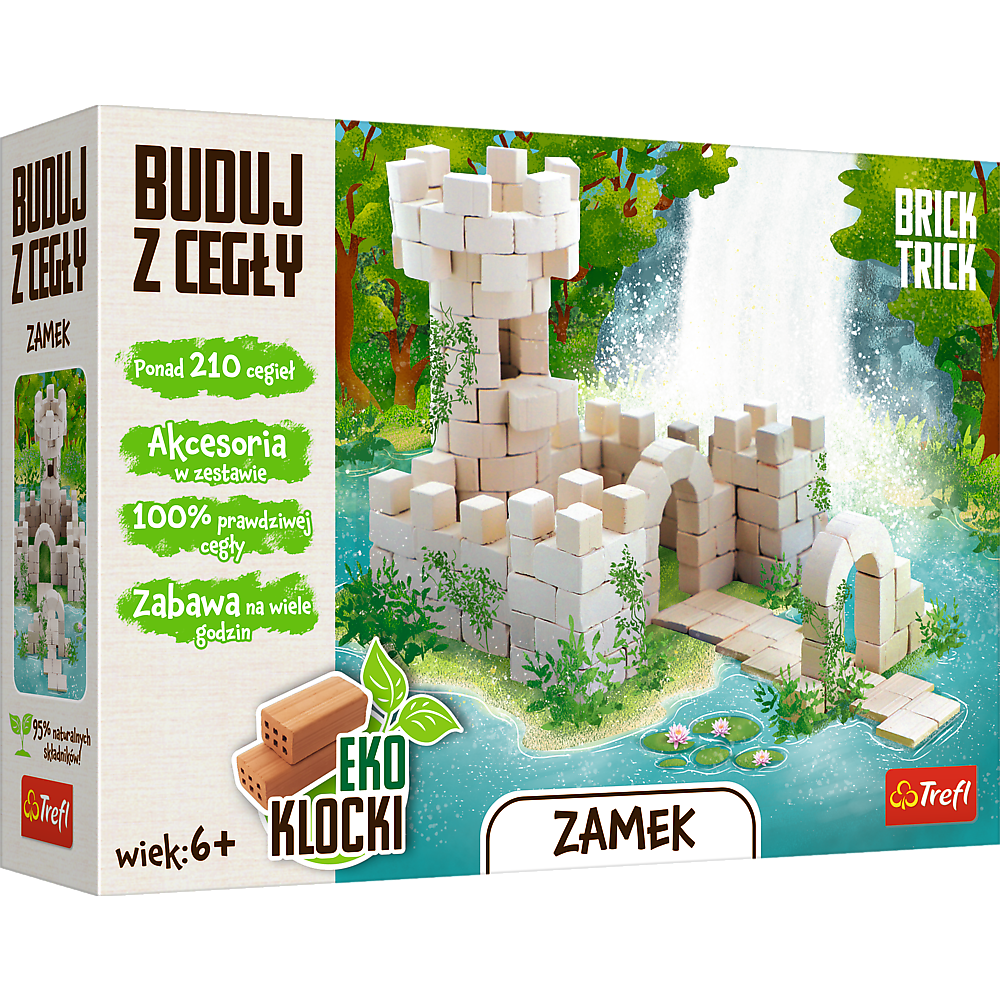 Wybuduj przepiękny Zamek niedaleko wodospadu, wykorzystując prawdziwe białe cegły i elementy dekoracyjne jak trawę czy krzew. Skorzystaj z dołączonych planów budowy lub użyj wyobraźni do stworzenia niepowtarzalnej konstrukcji. To nie koniec zabawy! Rozpuść konstrukcję w wodzie i buduj dalej, wykorzystując ponownie te same cegły! W opakowaniu znajdziesz: prawdziwe cegły, klej, elementy dekoracyjne, podstawkę, naklejkę i instrukcję. Dbamy o środowisko, dlatego zestaw zawiera aż 95% naturalnych składników! EKO klocki = zabawa murowana!
