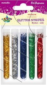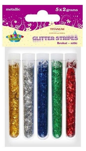 Brokat metaliczny nitki w fiolkach blister 5 kolorów x 2g. Mieniące się wszystkimi kolorami, sypkie brokaty doskonałe do dekoracji i zdobień.