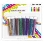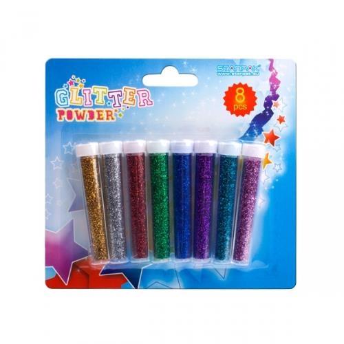 Brokat sypki w 8 różnych kolorach: zielony, złoty, czerwony, niebieski, srebrny, fioletowy, różowy, granatowy. Każdy zamknięty w osobnym pojemniczku o wadze 4g. Idealny sposób na urozmaicenie rysunków, świetną zabawę i piękne dekoracje.