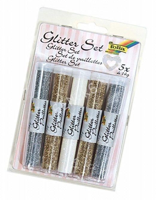 Brokat sypki XXL, 5*14g: 2*złoty, 2*srebrny, 1*lśniacy biały, Folia