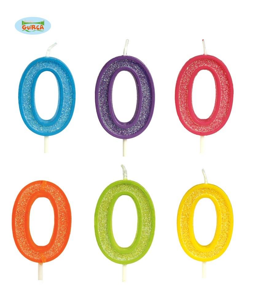 Brokatowa cyfra 0 świeczka, 4cm. Mix 6 kolorów