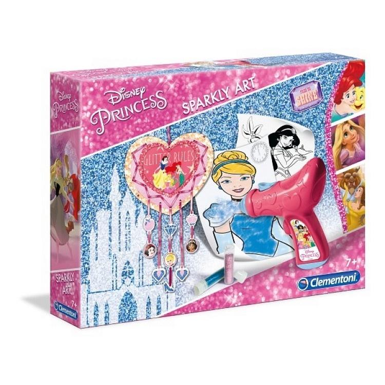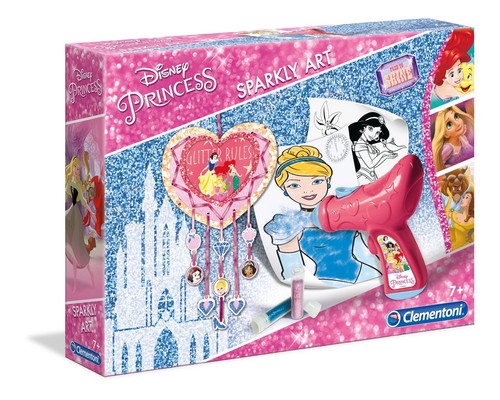 Oryginalny zestaw do robienia wielu błyszczących kreacji, dzięki czemu możesz wejść w fantastyczny świat księżniczek Disneya! Uwolnij swoją kreatywność dzięki brokatowi i baw się dekorując najpiękniejszą i najbardziej urzekającą scenerię ulubionej bajki! Zestaw zawiera pistolet z brokatem, kolorowy brokat i dwustronne naklejki, które można ozdobić.