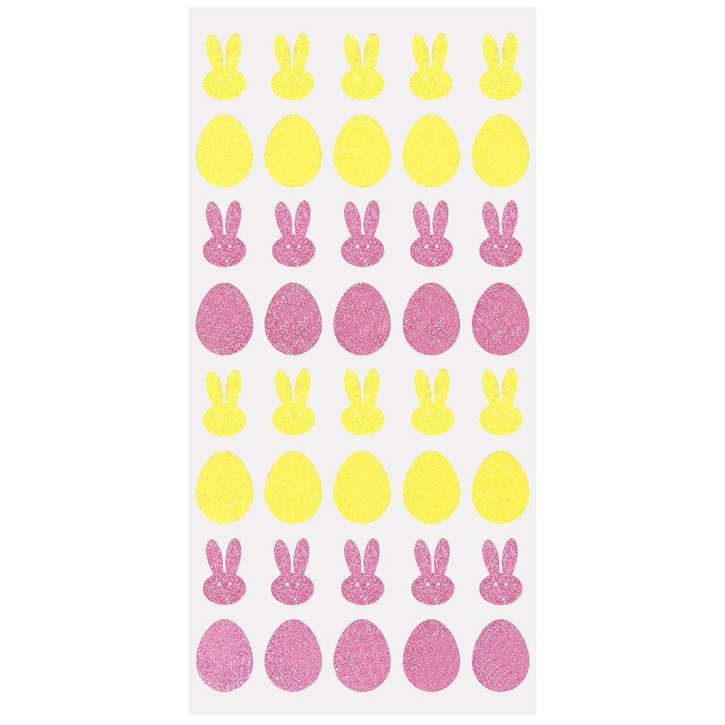 Piankowe naklejki brokatowe w kształcie zajączków i jajeczek. Idealne do dekoracji wielkanocnych, kartek świątecznych, prac szkolnych. Naklejki na blistrze o wymiarze 27x15 cm.
