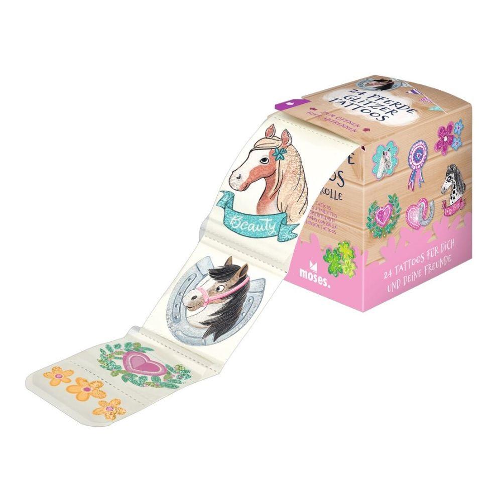 Brokatowe Tatuaże na Rolce, Konie Wyjątkowe tatuaże dla fanów koni: dzięki 24 fajnym, samoprzylepnym tatuażom z rolki, dzieci mogą tymczasowo ozdobić swoją skórę według własnego uznania. Świetne motywy z brokatem można łatwo oderwać od rolki i przykleić na wybraną część ciała. Dzięki wizerunkowi głowy konia, kwiatom i podkowom można z dumą pokazać miłość do koni. Po pewnym czasie tatuaże same schodzą, a nowe motywy mogą zostać naklejone na ramionach, nogach lub dłoniach. Obowiązkowa pozycja dla miłośników koni i świetny prezent do tornistra lub na urodziny dziecka! 24 fajne, samoprzylepne tatuaże dla małych wielbicieli koni. Zawierają wizerunek głowy konia, kwiaty, podkowy, serca i inne. Poszczególne tatuaże są perforowane i można je łatwo usunąć. Długość rolki: 1 metr. 100% wegańskie tzn. nie posiadają składników pochodzenia zwierzęcego, ani modyfikowanych genetycznie (GMO). Pieczęć Dermatest - "bardzo dobra". Wyprodukowano w Niemczech. Wymiary opakowania: 6 cm x 4, 5 cm 6 cm. Produkt przebadany dermatologicznie, bezpieczny dla konsumenta. Posiada pieczęć gwarancyjną Dermatest. UWAGA: Nie nadają się dla dzieci poniżej 3 roku życia. Ryzyko zadławienia. Produkty Moses są projektowane w Niemczech, ze szczególną dbałością o zrównoważony rozwój dziecka i wykonane z wysokiej jakości materiałów. Zabawki są wytwarzane zgodnie z filozofią "nauka przez zabawę", aktywnie wspierają i stymulują zarówno wyobraźnię jak i edukację dziecka.