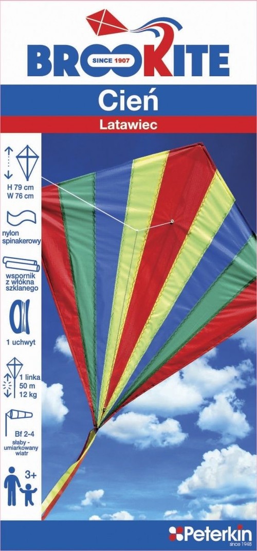 CIEŃ to klasyczny latawiec jednolinkowy, wykonany z nylonu spinakerowego. Posiada wsporniki z włókna szklanego oraz plastikowy uchwyt do nawijania na końcu linki. Przeznaczony do puszczania przy słabym i umiarkowanym wietrze 2-4 BF. Latawiec zapakowany jest w solidny, winylowy futerał z kartonową etykietą oraz instrukcją montażu. Brookite to firma produkująca latwace od 1907 r. Wszystkie latawce uszyte są z lekkich, wysokiej jakości materiałów, używanych między innymi do produkcji żagli. Zawartość produktu LATAWIEC Z NYLONU SPINAKEROWEGO, WSPORNIKI Z WŁÓKNA SZKLANEGO, 1 LINKA, 1 UCHWYT Po rozłożeniu:79x76cm