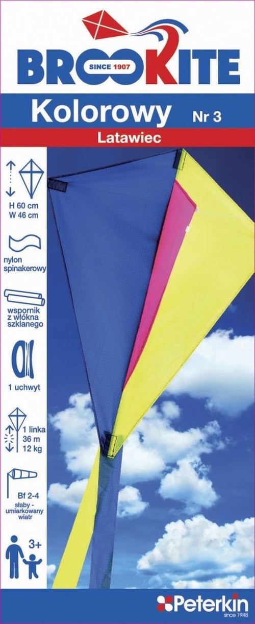 KOLOROWY NR 3 to klasyczny latawiec jednolinkowy, wykonany z nylonu spinakerowego. Posiada wsporniki z włókna szklanego oraz plastikowy uchwyt do nawijania na końcu linki. Przeznaczony do puszczania przy słabym i umiarkowanym wietrze 2-4 BF. Latawiec zapakowany jest w solidny, winylowy futerał z kartonową etykietą oraz instrukcją montażu. Brookite to firma produkująca latwace od 1907 r. Wszystkie latawce uszyte są z lekkich, wysokiej jakości materiałów, używanych między innymi do produkcji żagli. Zawartość produktu LATAWIEC Z NYLONU SPINAKEROWEGO, WSPORNIKI Z WŁÓKNA SZKLANEGO, 1 LINKA, 1 UCHWYT Wymiary po rozłożeniu: 60x46cm