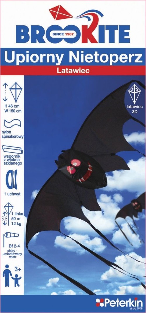 UPIORNY NIETOPERZ to fantazyjny, jednolinkowy latawiec 3D, wykonany z nylonu spinakerowego. Posiada wsporniki z włókna szklanego oraz plastikowy uchwyt do nawijania na końcu linki. Przeznaczony do puszczania przy słabym i umiarkowanym wietrze 2-4 BF. Latawiec zapakowany jest w solidny, winylowy futerał z kartonową etykietą oraz instrukcją montażu. Brookite to firma produkująca latwace od 1907 r. Wszystkie latawce uszyte są z lekkich, wysokiej jakości materiałów, używanych między innymi do produkcji żagli. Zawartość produktu LATAWIEC 3D Z NYLONU SPINAKEROWEGO, WSPORNIKI Z WŁÓKNA SZKLANEGO, 1 LINKA, 1 UCHWYT Po rozłożeniu: 46x150cm