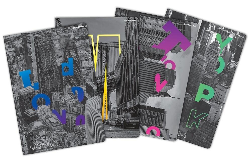 Czarno-białe wizerunki miast z kolorowymi napisami są nowoczesne i uniwersalne.