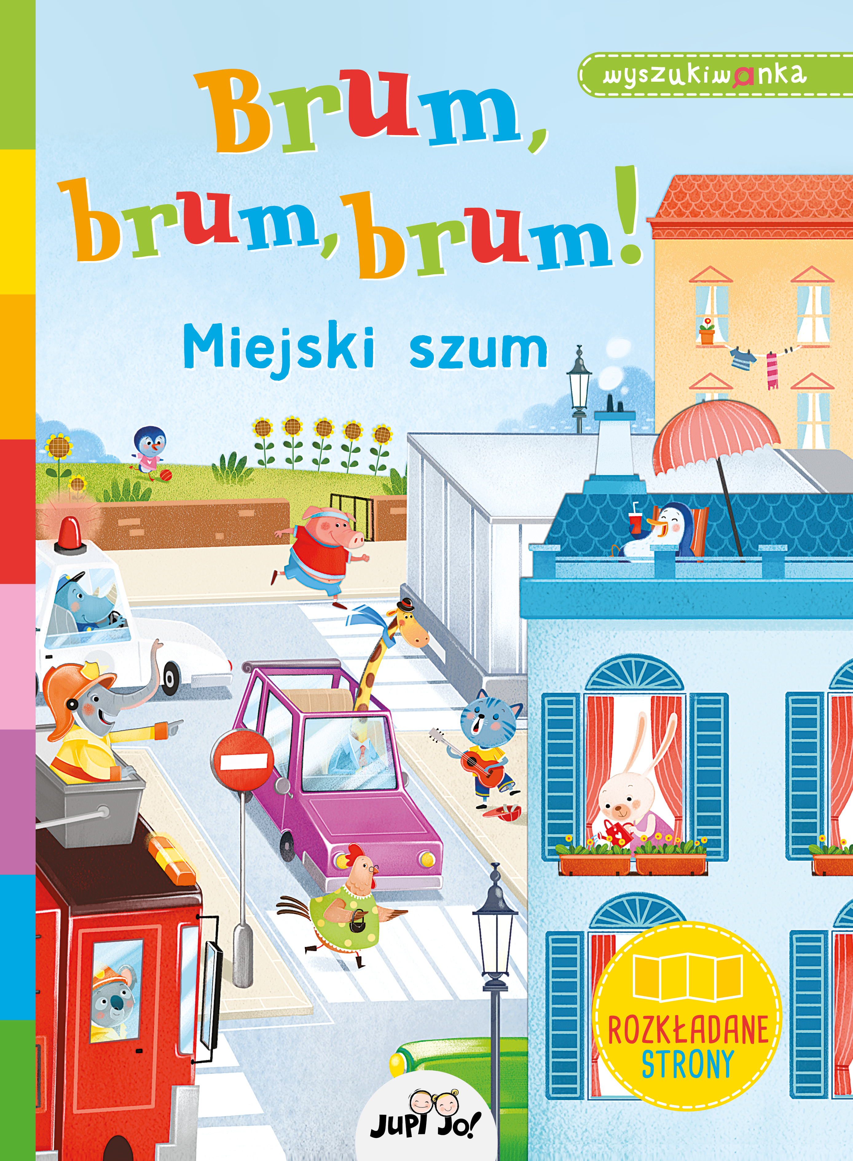 Brum, brum, brum! Miejski szum to duża, świetnie zilustrowana, książka-wyszukiwanka, w której dziecko podąża za autem pana Żyrafy, poznaje rozmaite pojazdy i szuka wskazanych obiektów. Z każdą kolejną stroną na ulicach jest coraz większy ruch. Trwa policyjny pościg, rozpoczęła się akcja gaśnicza straży pożarnej, pocztowe furgonetki wiozą przesyłki. Wyzwanie kończy się, kiedy powstajewielki korek! Mali czytelnicy zobaczą go na rozkładanych stronach.