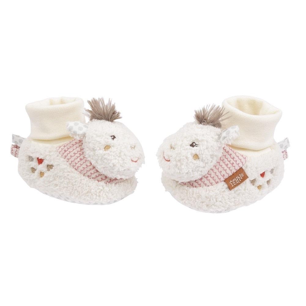 Wyjątkowo miękki i delikatny materiał przylega doskonale do stópek dziecka i zapewnia przyjemne ciepło przez cały dzień. Śliczne, solidnie uszyte, wyglądają bardzo zabawnie, wydają dźwięk przy każdym ruchu, co powoduje wielkie zainteresowanie malucha. Zmysły dziecka pobudzane są dźwiękiem grzechotki i wywołują u niego chęć kopania oraz przyciągania stóp blisko twarzy. Buciki wykonane zostały z materiałów najwyższej jakości, odpowiednie dla dzieci w wieku od 0 do 6 miesięcy. Idealne na prezent.