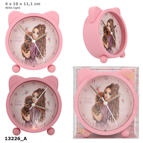Budzik Top Model, budzik w przezroczystym plastikowym opakowaniu, cichy, nie ma odgłosu tykania, ze światełkiem.