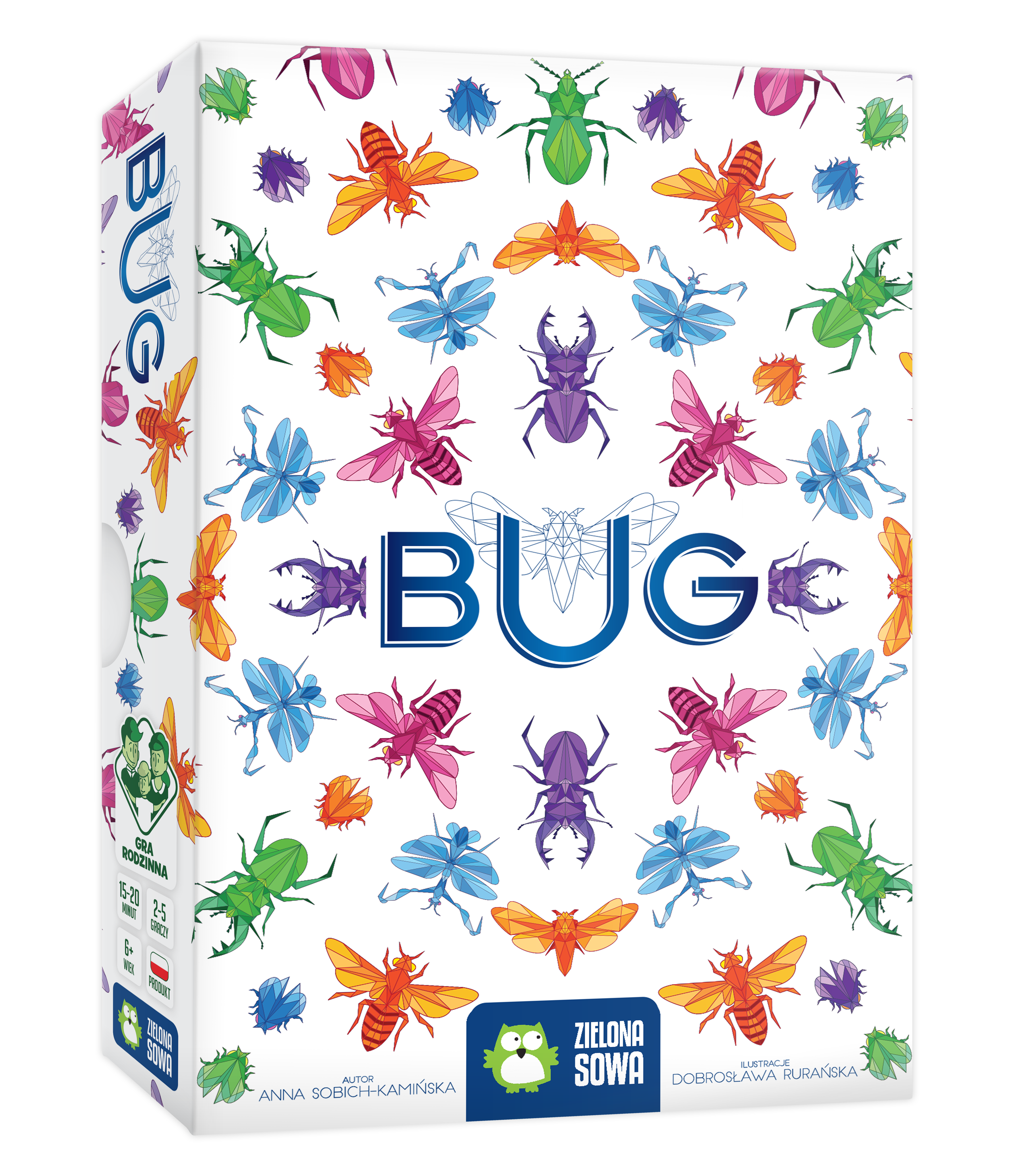 Spróbuj zapamiętać wszystkie owady i kolory zmieniające się na kartach jak w kalejdoskopie i pokonaj swoich przeciwników w pasjonującym pojedynku! Wygra osoba, która wykaże się najlepszą pamięcią i spostrzegawczością. „Bug” to prawdziwy trening szarych komórek! Każdy z graczy musi zapamiętać jak najwięcej elementów (konkretne owady i konkretne kolory), które zostały przedstawione na odkrytych wcześniej kartach. Mają na to tylko od 10 do 30 sekund! Następnie gracze odkrywają kartę z pytaniem (np. ile było much? Ile było niebieskich owadów? Ile było zielonych pszczół?) i udzielają odpowiedzi. Osoby, które popełnią błąd muszą położyć przed sobą jeden ze swoich żeton – bugów. Oznacza to, że ma już jeden błąd. Wygra gracz, który będzie miał najmniej bugów* (błędów). To świetna zabawa dla całej rodziny. Dzięki prostym, ale wciągającym zasadom w grę mogą grać osoby w różnym wieku! Gracze również mogą wybrać jeden z dwóch wariantów: wariant podstawowy (dla dwóch do pięciu graczy) i wariant dwuosobowy (dla dwóch graczy - pojedynek z elementami blefu). Bug – owad (ang.) albo trudny do wykrycia błąd w programie komputerowym. Wiek graczy: 6+ Liczba graczy: 2-5 Czas rozgrywki: 15-20 minut