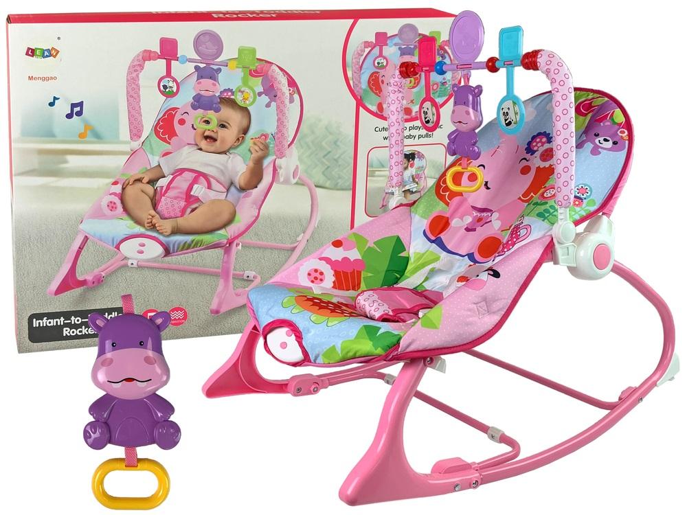Kołyska Bujaczek Fotelik Krzesełko 2w1 Różowy Hipopotam Dźwięki Wibracja Wygodny fotelik, w którym maluszek może odpoczywać i oddawać się zabawie, jest bardzo istotny podczas kompletowania wyprawki dla niemowlaka. Prezentujemy różowy bujaczek ozdobiony motywem bajkowym. Zaciekawi każdego malucha. Zaprojektowano go z myślą o noworodkach i starszych maluchach. Mogą z niego korzystać dzieci do 3 roku życia. Maksymalne obciążenie to aż 18 kg. Kołysanie to naturalny ruch dla Twojego dziecka, przypominający błogi czas spędzony w brzuszku mamy. Twój maluch kołysanie traktuje jako coś znanego i bezpiecznego. To właśnie podczas kołysania się uspokaja. Leżaczek dzięki intuicyjnej obsłudze, a przede wszystkim prostej konstrukcji, może być używany na różne sposoby. Z powodzeniem wykorzystasz go jako bujaczek dla maluszka, a także jako klasyczny fotelik dla dziecka, który rozłożysz w każdych warunkach. Wielofunkcyjność siedziska dla malucha sprawia, że możecie zabrać go ze sobą wszędzie, a w zależności od sytuacji zmienić jego zastosowanie. Dodatkowo nad siedziskiem znajduje się okrąg z przyjaznymi małymi maskotkami. Hipopotam po pociągnięciu za rączkę odtwarza muzykę, a boczne wiszące kolorowe zabawki przypominające zwierzątka stymulują zmysł dziecka. Ten fotelik rośnie razem z dzieckiem ! Gdy dziecko urośnie, wystarczy usunąć pasy zabezpieczające. Zawieszki z pewnością przyciągną uwagę dziecka, zachęcając do treningu rączek i zabawy. Bujak ukoi zmysły dziecka, pomoże w zasypianiu, dzięki wibracją. Posiada następujące funkcje: -siedzisko odchylane w 2 pozycjach - możliwość prania tkaniny w pralce - uspokajające wibracje, ułatwiające zasypianie - głębokie siedzisko - 3- punktowy pas zabezpieczający - wyjmowany okrąg z zabawkami, którego można zmienić pozycję do przodu bądź do tyłu Wymiary krzesełka: 64 cm x 40 cm x 66 cm Wymiary siedziska: długość- 71 cm szerokość- 40 cm max głębokość siedziska- 15 cm Wymiary wiszących zabawki: około 14 cm x 10 cm x 4 cm Wysokość okręgu od bujaczka: około 30 cm Długość okręgu: około 72 cm Wymiary opakowania: 53 cm x 39 cm x 9 cm Bujaczek zasilany jest 3 sztukami baterii AA 1,5V, które nie są dołączone do zestawu, natomiast zebra posiada dwie baterie AG13. Przeznaczony dla dzieci od pierwszych dni życia. Zgodny z normą EN71. Zabawka wykonana jest z certyfikowanego materiału.