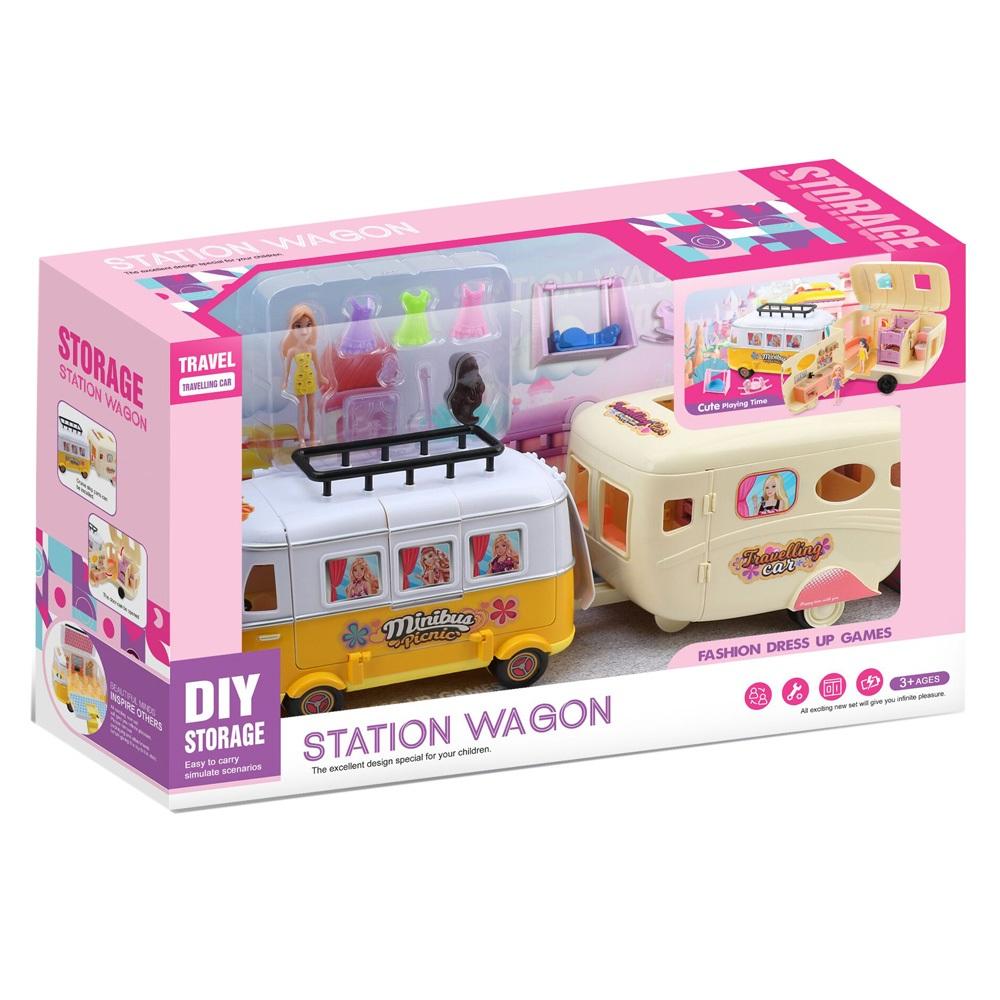 Bus z przyczepą. W zestawie dwie lalki, którym można zmieniać ubranka. Piętrowe łóżko, bujany konik, huśtawka, mebelki kuchenne, kanapa oraz WC. Wymiary opakowania: 49.5 x 14.5 x 28.5 cm