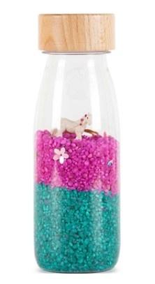 Butelki sensoryczne od Petit Boum to kolorowy świat zamknięty w niewielkiej, przystępnej dla dziecka formie. Bawią, uczą i stymulują wyobraźnię! Pozwól swojemu dziecku poruszać, potrząsać i manipulować butelką, aby odkrywać kolory i figurki tematyczne zamknięte w butelce. Różnorodna zawartość butelek pozwala odkrywać nowe, ciekawe dźwięki charakterystyczne dla ukrytych w butelce elementów. Zabawa butelką od Petit Boum rozwija zmysły i wyobraźnię dziecka! Czy rozpoznasz butelki po ich dźwiękach? Czy znajdziesz w środku jednorożca? :)