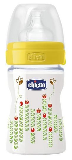 Butelka do karmienia Chicco Wellbeing o pojemności 150 ml, wykonana z Polipropylenu, wyposażona w fizjologiczny smoczek silikonowy o normalnym przepływie, dla noworodków od urodzenia. Nie zwiera Bisfenolu A; łatwa do mycia i niezwykle praktyczna dla mam. Z ładnymi i atrakcyjnymi zdobieniami.