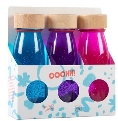 Zestaw składa się z 3 butelek sensorycznych: Float - Niebieskiej, Różowej oraz Fioletowej.