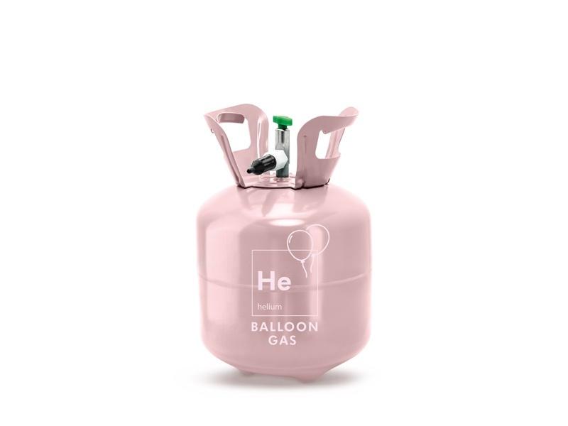 Butla z helem na maks. 20 szt. balonów w kolorze jasnoróżowym z czarnym nadrukiem, pojemność ok. 0.15 m.