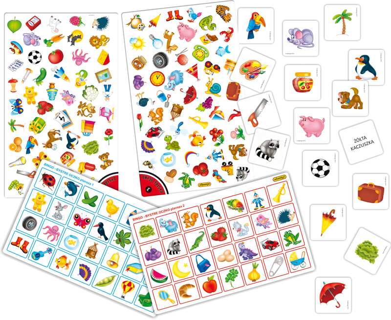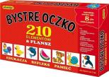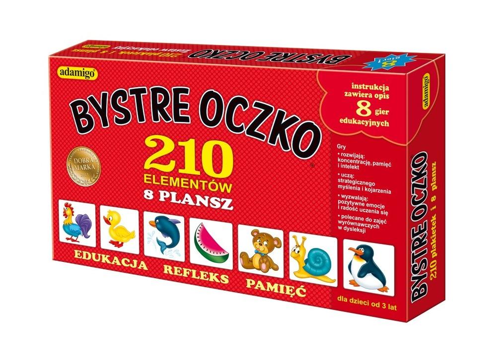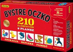 Mądra, atrakcyjna graficznie i starannie wykonana gra przeznaczona dla młodszych dzieci. Gra wyrabia spostrzegawczość, refleks, pamięć, ćwiczy analizę wzrokową i słuchową; naucza rozróżniać kolory i nazywać przedmioty. Chociaż w instrukcji zamieszczamy 8 propozycji gier, zestaw można wykorzystać na wiele sposobów. „BYSTRE OCZKO” polecamy do zabawy i edukacji zarówno w gronie rodzinnym, jak i w przedszkolach oraz szkołach w klasach 0-II. Gry polegają na odszukaniu na planszy takiego samego obrazka, jaki widnieje na wylosowanej przez osobę prowadzącą grę, plakietce. Na drugiej stronie plakietki wyszczególniona jest nazwa i krótki opis przedmiotu. Liczba graczy: 1-8 Wiek: 3+