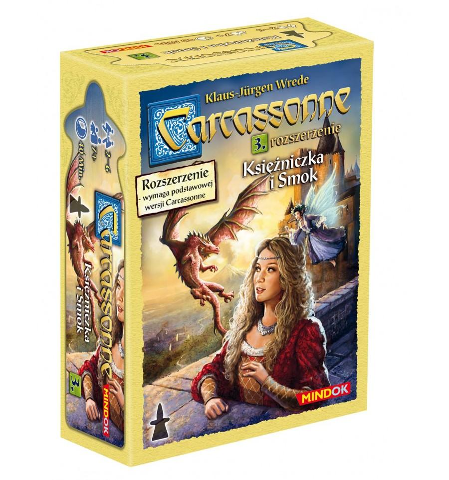 Dodatek do familijnej gry Carcassone, która w 2002 roku zdobyła nagrodę za najlepszą grę planszową! Dodatek gwarantujący wspaniałą zabawę. Księżniczka i Smok to dodatek, wprowadzający do Carcassonne elementy fantasy. Ziemie wokół miasta zostają nawiedzone przez potężnego smoka oraz pomocne wróżki, w miastach pojawiają się kapryśne księżniczki, a wieśniacy, w obawie przed smokiem, zaczynają drążyć podziemne tunele. Rozszerzenie posiada kilka nowych zasad, nowe pionki (księżniczki i smoka) oraz 30 nowych żetonów, w tym wulkany czy magiczne portale. Wszystkie wersje językowe są wykonane w ten sam sposób i można je ze sobą łączyć.