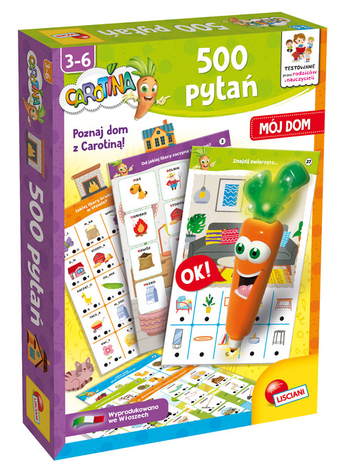 500 pytań Carotiny pomoże dziecku poznać wiele przedmiotów z domu i jego otoczenia dzięki 30 interaktywnym kartom edukacyjnym. Wystarczy użyć mówiącej i świecącej Carotiny, aby odpowiedzieć na pytania, naciskając końcówką długopisu czarne kropki przypisane do odpowiedzi. W przypadku poprawnej, Carotina radosnym okrzykiem nagrodzi dziecko. W przeciwnym razie, smutnym westchnięciem zmotywuje je do podjęcia kolejnej próby. Dziecko może także zagrać w Szukaj i znajdź, wyszukując przedmioty na ilustracjach Miłej zabawy!