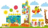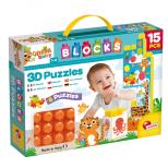 Klocki konstrukcyjne Carotina dla najmłodszych. Zestaw składa się z 15 klocków, które posiadają naklejki, umożliwiające złożenie kolorowych ilustracji. Dziecko poza kreatywną zabawą i ćwiczeniem zdolności manualnych, ćwiczy również dopasowywanie, próbując ułożyć kompletny obrazek. Klocki wykonane są z wytrzymałego plastiku, odpornego na złamania.