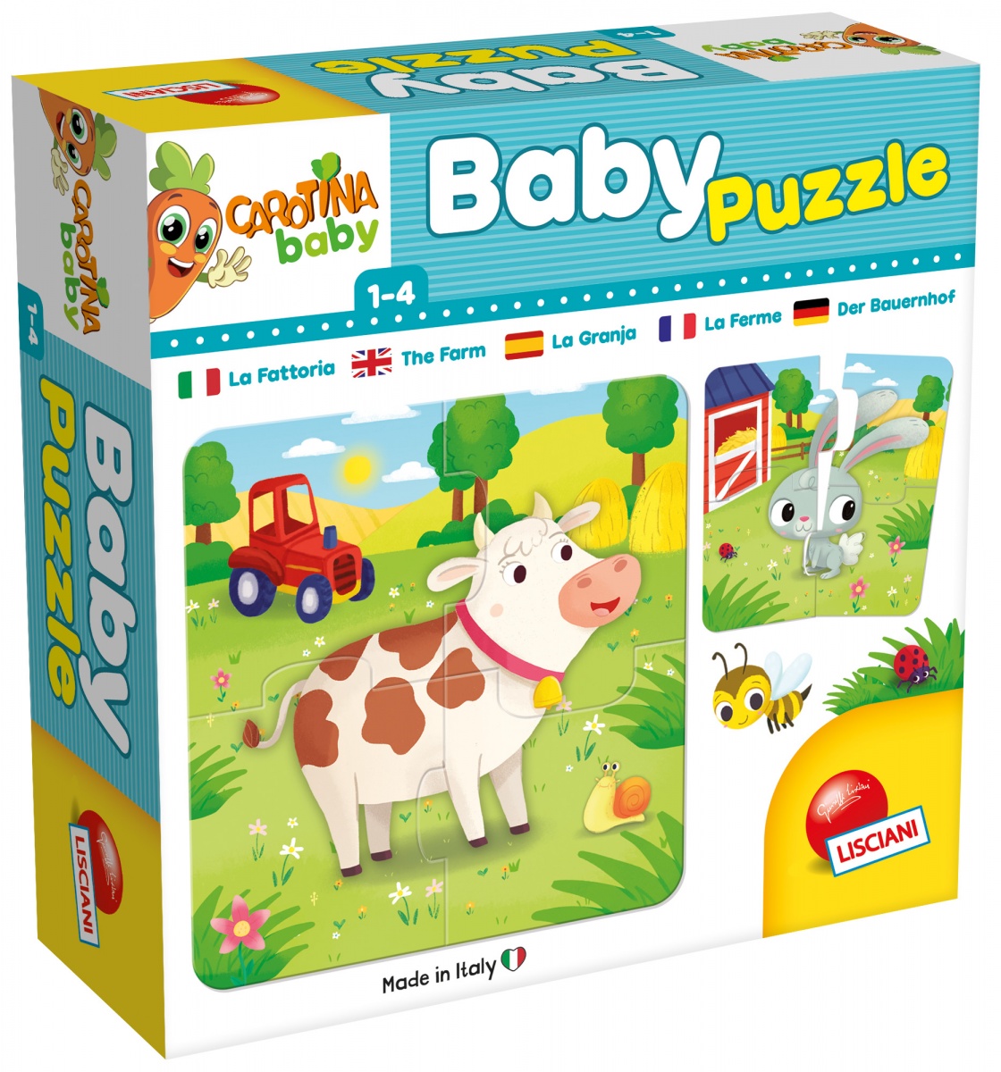 Puzzle farma, składające się z trwałych kolorowych kafli, pozwalają na złożenie serii zwierzęcych obrazków. Gra rozwija zdolności manualne dzieci, szczególnie ważne w najmłodszych latach. Seria Carotina Baby to seria Lisciani, skierowana do dzieci w wieku 0-3 lat.