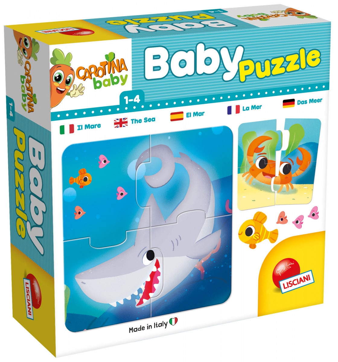 Puzzle ocean, składające się z trwałych kolorowych kafli, pozwalają na złożenie serii zwierzęcych obrazków. Gra rozwija zdolności manualne dzieci, szczególnie ważne w najmłodszych latach. Seria Carotina Baby to seria Lisciani, skierowana do dzieci w wieku 0-3 lat.