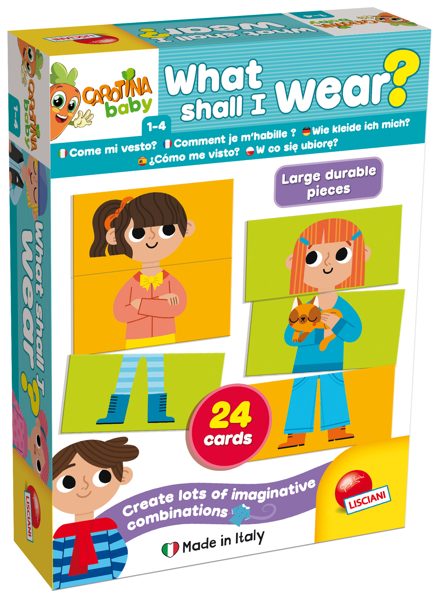 Zestaw edukacyjny włoskiego producenta Lisciani, dzięki któremu dzieci poznają ubrania, bawiąc się w grę logiczną, dzięki której mogą dopasowywać do siebie różne elementy. Opakowanie zawiera duże i wytrzymałe puzzle wysokiej jakości. Seria Carotina Baby pozwala dzieciom na zaspokojenie ich naturalnej ciekawości i poznanie otaczającego ich świata. Dzięki 8 sylwetkom osób dzieci mogą tworzyć wiele różnorodnie ubranych postaci, dobierając różne karty z ubiorem. Zabawa stymuluje rozwój logiki i zmysłu obserwacji. Materiały sa bezpieczne nawet dla najmłodszych dzieci. Zawartość: 224 fiszki instrukcja. Wiek 1-4 lata