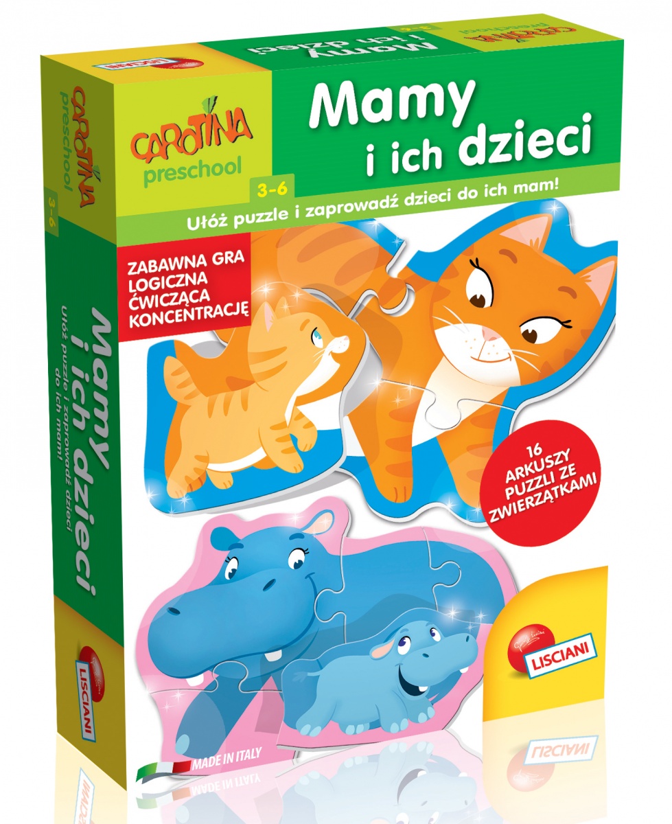 Gra polegająca na ułożeniu 16 arkuszy puzzli, przyporządkowując każde młode zwierzątko do jego mamy! Opakowanie zawiera 16 elementów z dorosłymi zwierzętami oraz 16 elementów z młodymi zwierzętami.