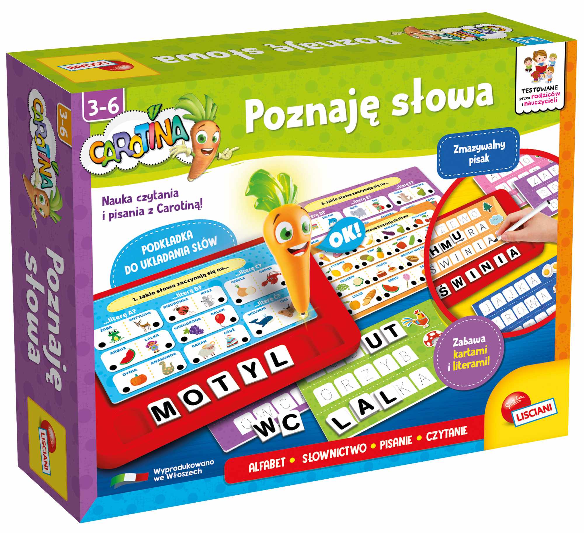 Edukacyjna gra, która w ciekawy sposób rozwija słownictwo, umiejętność pisania, czytania oraz znajomość alfabetu! W opakowaniu znajduje się tabliczka do układania słów, tekturowe karty oraz litery. Program edukacyjny umożliwia dzieciom stopniową naukę – układanie słów o coraz większej liczbie liter, elektroniczny quiz i możliwość pisania suchościeralnym pisakiem po zmazywalnych tabliczkach. Idealna dla małych odkrywców, którzy stawiają pierwsze kroki w świecie słów. Zawartość: podkładka do układania słów, 8 dwustronnych kart, 6 dwustronnych tablic, suchościeralny pisak, gąbka, 70 liter, świecąca i mówiąca Carotina, instrukcja.
