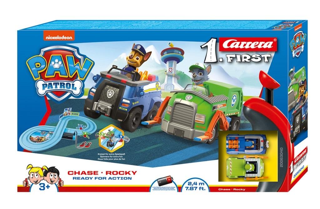 Wuff, wuff! Każdy mały pies popularnych czworonożnych przyjaciół z serii PAW Patrol ma swój własny środek transportu, a co za tym idzie także inne zadania, talenty i umiejętności. W nowym zestawie Carrera FIRST "PAW Patrol - Ready for Action" rozpoczynasz ekscytujące przygody wraz z psimi bohaterami. Z psem policyjnym Chase w swoim niebieskim radiowozie i specjalistą od napraw Rocky'ego w zielonej ciężarówce do recyklingu AR9, zawsze wyruszysz na nowe doświadczenia. Razem z czworonożnymi przyjaciółmi zapewniasz bezpieczeństwo i czystość w pokoju dziecięcym.