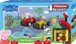 W nowym zestawie Carrera FIRST Peppa Pig - Kids GranPrix jest mnóstwo świetnej zabawy ze Świnką Peppą i jej młodszym bratem Georgem. Dzięki oryginalnej licencji rodzeństwo, Peppa i George ścigają się na 2,4 m torze. Najmniejsi rajdowcy od 3 lat z niecierpliwością czekają na wyścigi z Peppą i Georgem. Jasnoniebieski tor wyścigowy jest również super zabawą w podróży! Dzięki zasilanemu bateryjnie, tor można łatwo zestawić i ponownie zdemontować. Oprócz prostych szyn, ekscytujące zakręty i dodatkowe elementy zapewniają ekstra zabawę.