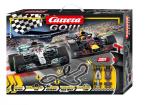 W zestawie znajduje się: - Mercedes-AMG F1 W09 EQ Power+ "L. Hamilton, No.44" 64128 - Red Bull Racing RB14 "M.Verstappen, No.33" 64144 -1 Szyna przyłączeniowa -1 Transformator -2 Kontrolery - skrzyżowanie - pochyły zakręt - pętla - licznik okrążeń - zapasowe wymienne szczotki stykowe i prowadnice - instrukcja PL Rozmiary po rozłożeniu: 175 x 122 cm Długość toru: 6.3 m Carrera GO!!! to system startowy do Świata Wyścigów Carrera, stworzony w skali 1:43. Wszystkie zestawy z tej serii zawierają kontroler turbo doładowania, a także oryginalne, licencjonowane samochody, wykonane z ogromną dbałością o szczegóły. Do każdego z nich dołączony jest zawsze dodatkowy zestaw szczotek stykowych. Systemy torów są niezwykle łatwe w montażu i demontażu, dzięki unikalnemu systemowi zatrzasków.