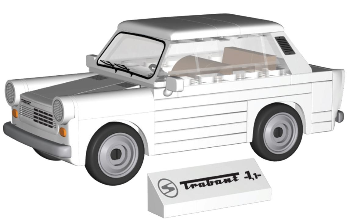 Kultowy i szalenie popularny samochód pochodzący z Niemieckiej Republiki Demokratycznej. Jego opływowe kształty i stylowe nadwozie budziły kiedyś zachwyt i zazdrość. Model Trabant 1.1 był produkowany w latach 1989 - 1991. Model w skali 1:35 złożony w 100% z klocków COBI wiernie oddaje bryłę nadwozia oryginalnego Trabanta 1.1. Budowa z klocków konstrukcyjnych pozwala na drobne modyfikacje i przeróbki. Model znakomicie nadaje się na półkę każdego fana motoryzacji i kolekcjonera jak i do zabawy.