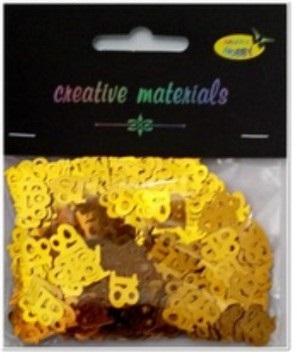 Elementy z folii Alu w kształcie liczby 18 w kolorze złotym . Pakowane w opakowania z eurozawieszką zawierające 15 gram elementów.