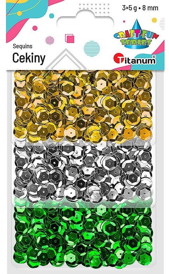 Cekiny okrągłe. Zestaw 3 kolorów po 5 g. Kolory metaliczne: złoty, srebrny, zielony. Średnica cekinów: 8 mm.