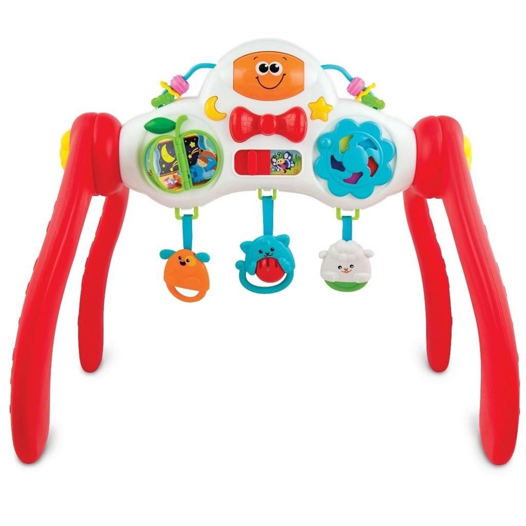 Rośnie razem z dzieckiem. Jest niezastąpione w 3 etapach rozwoju dziecka: 1. aktywizuje dziecko leżące 2. zabawia dziecko siedzące 3. jest stabilnym oparciem dla dziecka stojącego Po rozłożeniu zabawki leżące dziecko może bawić się Mini-Siłownią.