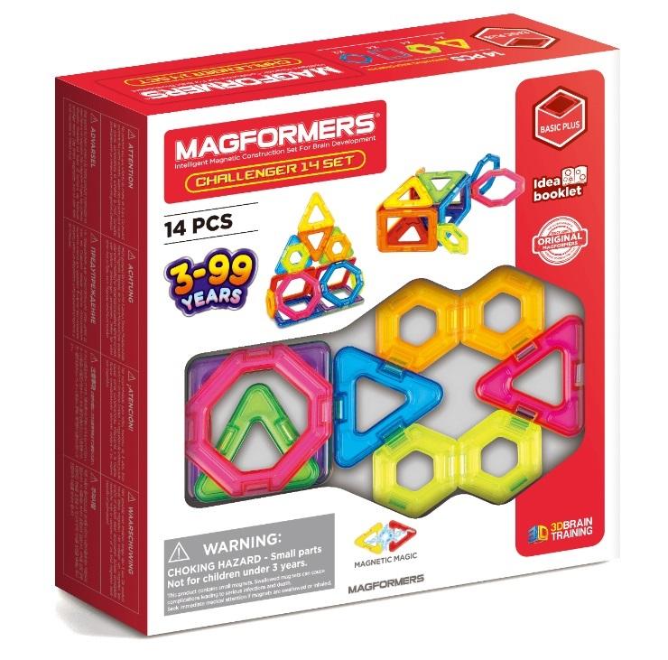 MAGFORMERS CHALLENGER SET to klocki z wbudowanymi silnymi magnesami neodymowymi, które zawsze się przyciągają. Wystarczy zbliżyć do siebie ściankami dwa klocki, a one natychmiast ze sobą się połączą. Za pomocą klocków wzorowanych na kształt figur geometrycznych można zbudować wspaniałe trójwymiarowe budowle. W skład zestawu wchodzą: 4 trójkąty, 4 pięciokąty z wypełnieniem, 4 kwadraty oraz 2 siedmiokąty.