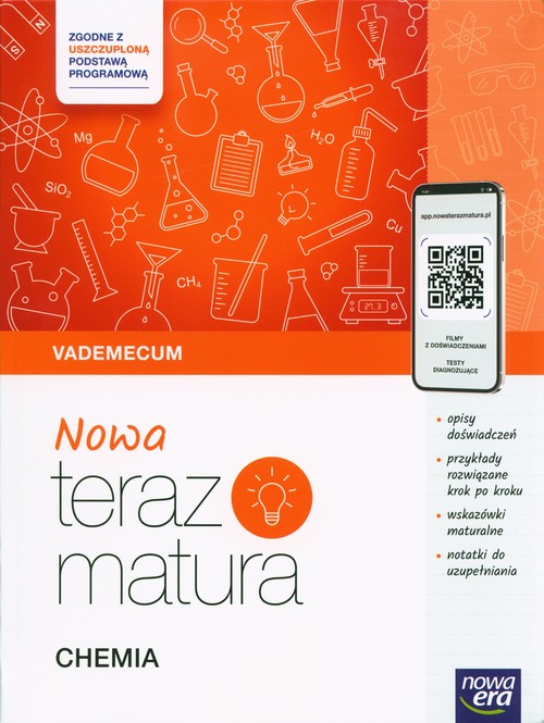 Vademecum ,,NOWA Teraz matura. Chemia"" pozwala uporządkować i powtórzyć treści przed egzaminem. Jest w pełni skorelowane ze Zbiorem zadań maturalnych ,,NOWA Teraz matura. Chemia. Część 1. i 2."" i zawiera kody dostępu do dodatkowych materiałów na app.nowaterazmatura.pl.