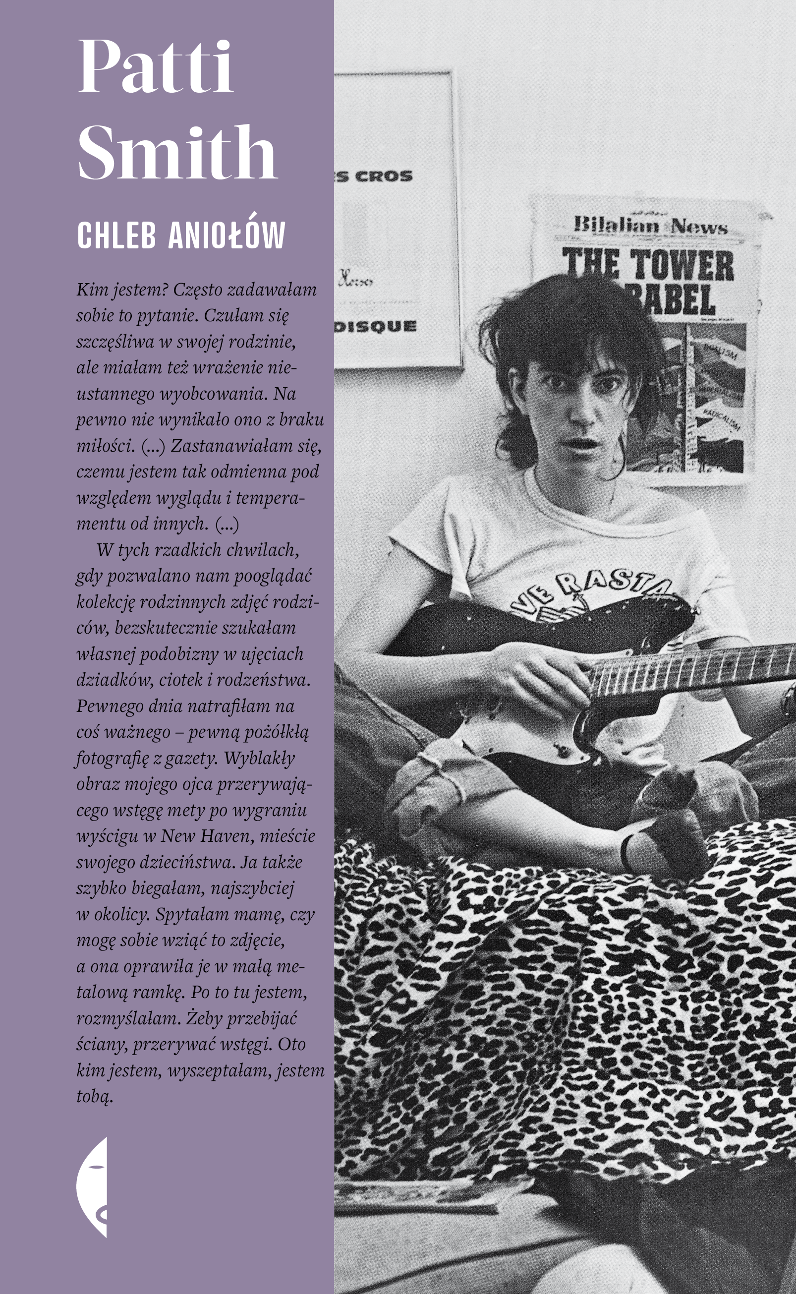 "Wczesne dzieciństwo ma proustowskie, wypełnione okresami izolacji z powodu choroby i rekonwalescencji. Dorastanie – dickensowskie, rozgrywające się w przeznaczonym do rozbiórki kompleksie mieszkaniowym, gdzie dzieci zapadają na gruźlicę, kolejni sąsiedzi znikają, a po domach grasują szczury. Jako nastolatka poznaje Rimbauda i Dylana, dzięki którym otwiera się na sztukę. Wyrusza do Nowego Jorku i próbuje sił w pisaniu, jednak przyjaciele ze sceny undergroundowej rozbudzają w niej pragnienie artystycznego spełnienia na większą skalę. Ale po pierwszych znaczących sukcesach muzycznych spotyka Freda „Sonica” Smitha i zostawia nowojorskie życie za sobą, by zamieszkać wśród starych wierzb i bujnych grusz nad kanałem w St. Clair Shores. Gdy z biegiem lat kolejni bliscy Patti odchodzą, ratunkiem przed melancholią okazują się, jak wiele razy wcześniej, muzyka i literatura – jedyne stałe w jej życiu napędzanym twórczą wolnością i siłą wyobraźni. Chleb aniołów to wyrafinowana autobiograficzna opowieść jednej z najważniejszych artystek XX i XXI wieku. Smith nie zaleca się do czytelnika, ale z odwagą i charakterystyczną dla siebie wrażliwością się przed nim odsłania. Jej nowa książka jest także listem miłosnym do czasem okrutnego, a czasem pięknego świata. "