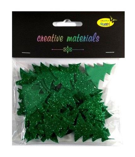 Zestaw elementów w formie choinek z pianki brokatowej wielkości 40 mm , zawierający ok. 60 elementów, pakowany w eleganckie opakowanie z eurozawieszką. Elementy można naklejać na każdą powierzchnię lub używać do innych zdobień. Opakowanie zawiera elementy w kolorze zielonym.
