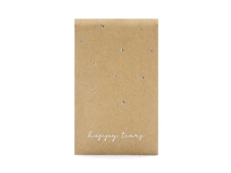 Chusteczki higieniczne spakowane w kraftową kopertę ze srebrnym nadrukiem i napisem Happy tears, zestaw zawiera 10 kopert, w każdej po 3 chusteczki. Wymiary pojedynczej koperty ok. 7,5 x 12 cm.(1 op. / 10 szt.)