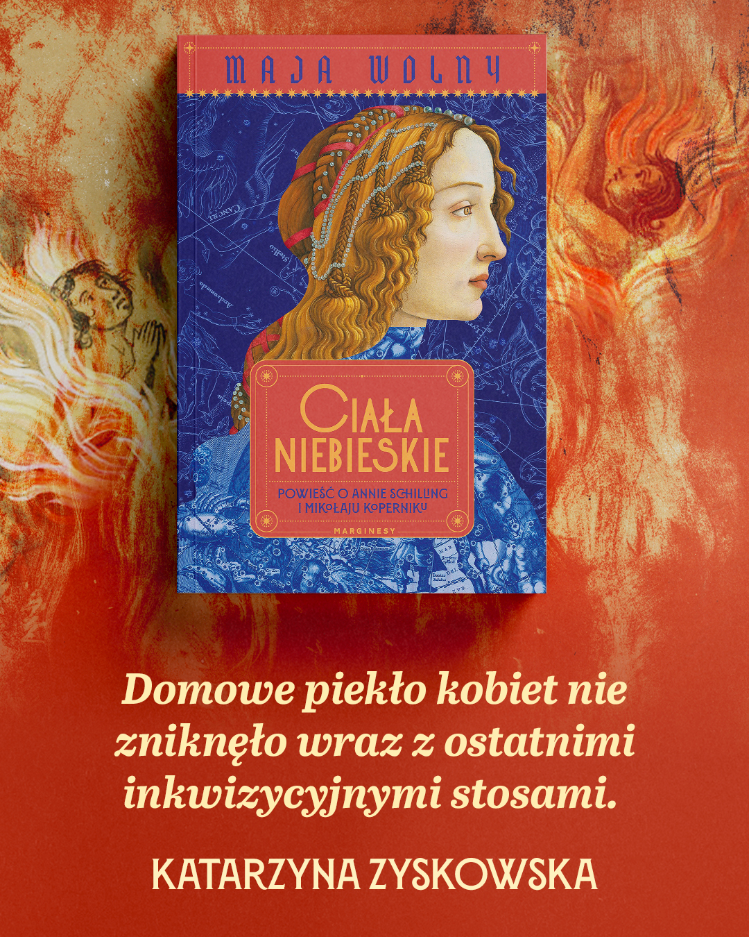 Maja Wolny odmalowuje sugestywny obraz renesansowego świata - barwnego i zmysłowego, lecz bezwzględnie karzącego każdego, kto wykracza poza sztywne ramy konwenansu. Ciała niebieskie to hołd dla kobiecej siły, ale i gorzka przypowieść o losie tych, które ośmielają się żyć na własnych zasadach. Miłość i poznanie są tu aktami wolności, a świat naprawdę zmieniają ci, którzy nie boją się myśleć i czuć głębiej.