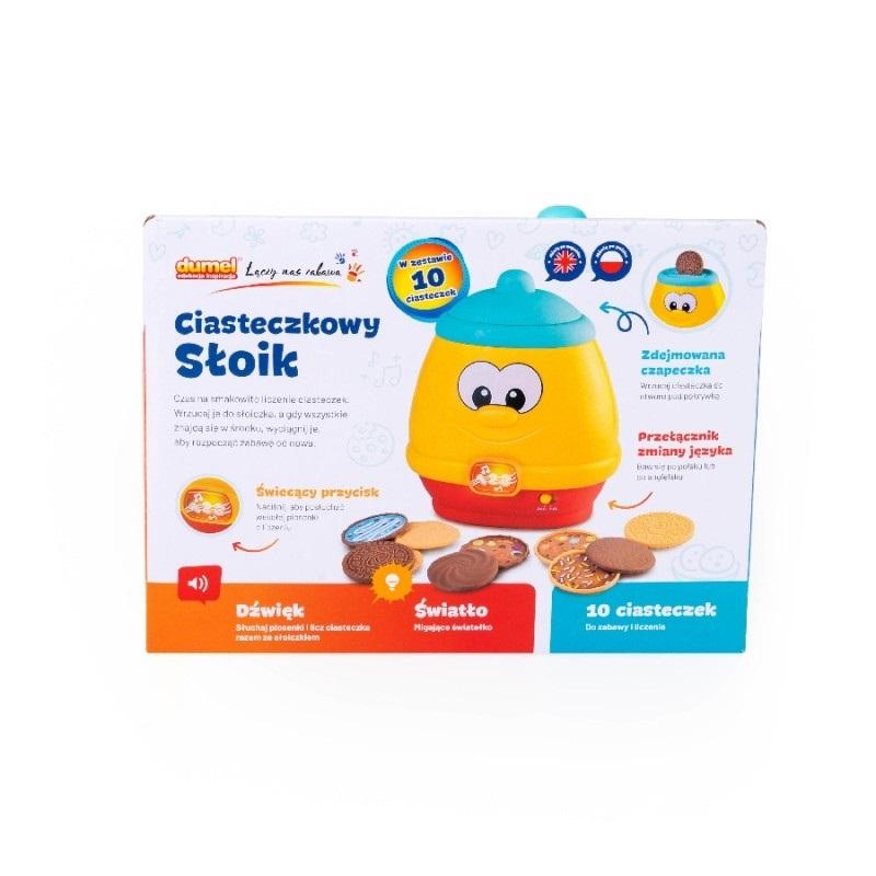 Słoiczek - łakomczuszek potrzebuje ciasteczek! Zabawka głośno liczy wrzucane do środka zabawkowe ciastka, od 1 do 10. Gdy maluch poradzi sobie z tym zadaniem, może otworzyć klapkę, znajdującą się z tyłu słoika, aby wyjąć smakołyki i rozpocząć zabawę od nowa. Gdy naciśniemy przycisk z nutkami, zaświeci się on, a słoiczek zaśpiewa wesołą piosenkę o ciasteczkach. Zabawka jest dwujęzyczna, więc gdy dziecko opanuje już liczenie w języku polskim, może przełączyć się na zabawę w języku angielskim. Produkt przeznaczony jest dla dzieci od 12 miesiąca życia.